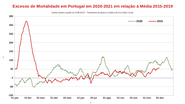 Este aumento de mortalidade pós-infecção poderá já a estar a acontecer em Portugal. Apesar de se afirmar que morrem agora muitos menos pessoas com COVID-19 do que há um ano, a verdade é que a diferença na mortalidade total por todas as causas entre o presente e o mesmo período há um ano é muito menor do que a diferença entre os óbitos com COVID-19. Neste momento, a média corrente de sete dias de óbitos com COVID-19 em Portugal ronda as 11-12 vítimas mortais, enquanto há um ano era de 76-77 vítimas mortais, uma diferença de 65 óbitos. Mas se há um ano por esta altura morriam cerca de 76-77 pessoas acima do esperado de acordo com a média de 2015-2019, agora estão a morrer 56-57 pessoas acima do esperado de acordo com a mesma média. Ou seja, a diferença de 65 óbitos a mais com COVID-19 há um ano, traduz-se num aumento de mortalidade total de apenas 20 óbitos em comparação com o mesmo período deste ano. Mas porque morrem mais 40-45 pessoas diariamente do que o esperado sem ser por COVID-19? O colapso REAL do SNS, principalmente nos cuidados de saúde primários e principalmente no distrito de Lisboa, explicará parte deste aumento da mortalidade não COVID-19 deste ano. Mas arrisco afirmar que a mortalidade a longo prazo, secundária à COVID-19, é outro factor.